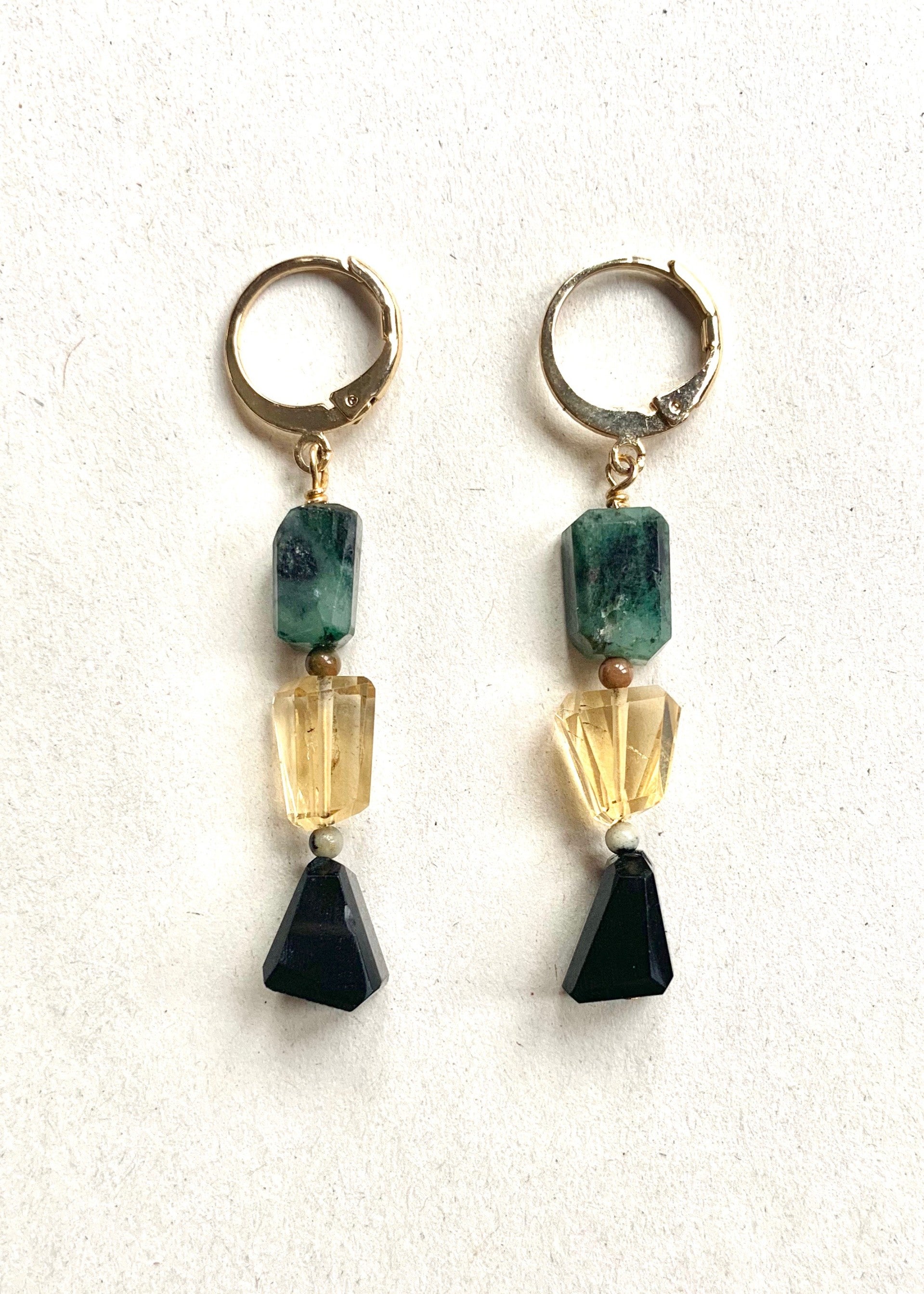 Krachtig en prachtig zijn deze Oorbellen van Smaragd, Citrien en Onyx met de kleine Dalmatier Jaspis pareltjes tussen de stenen komen de grote stenen mooi tot hun recht!