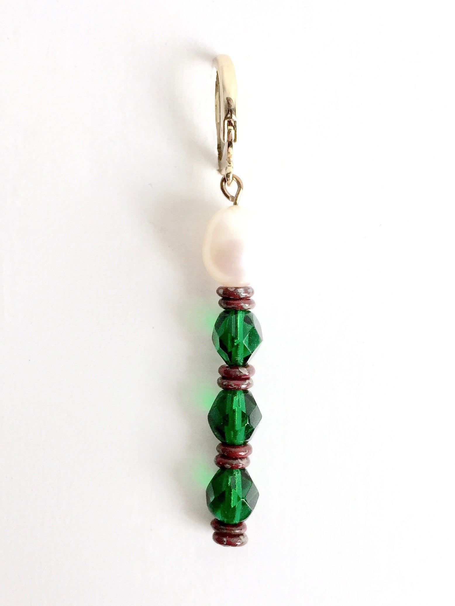 Stoer maar klassiek zijn deze scepters geregen met een grote parel gecombineerd met heldere groene facet geslepen Tjechische glaskralen afgewisseld met donkererode platte kraaltjes