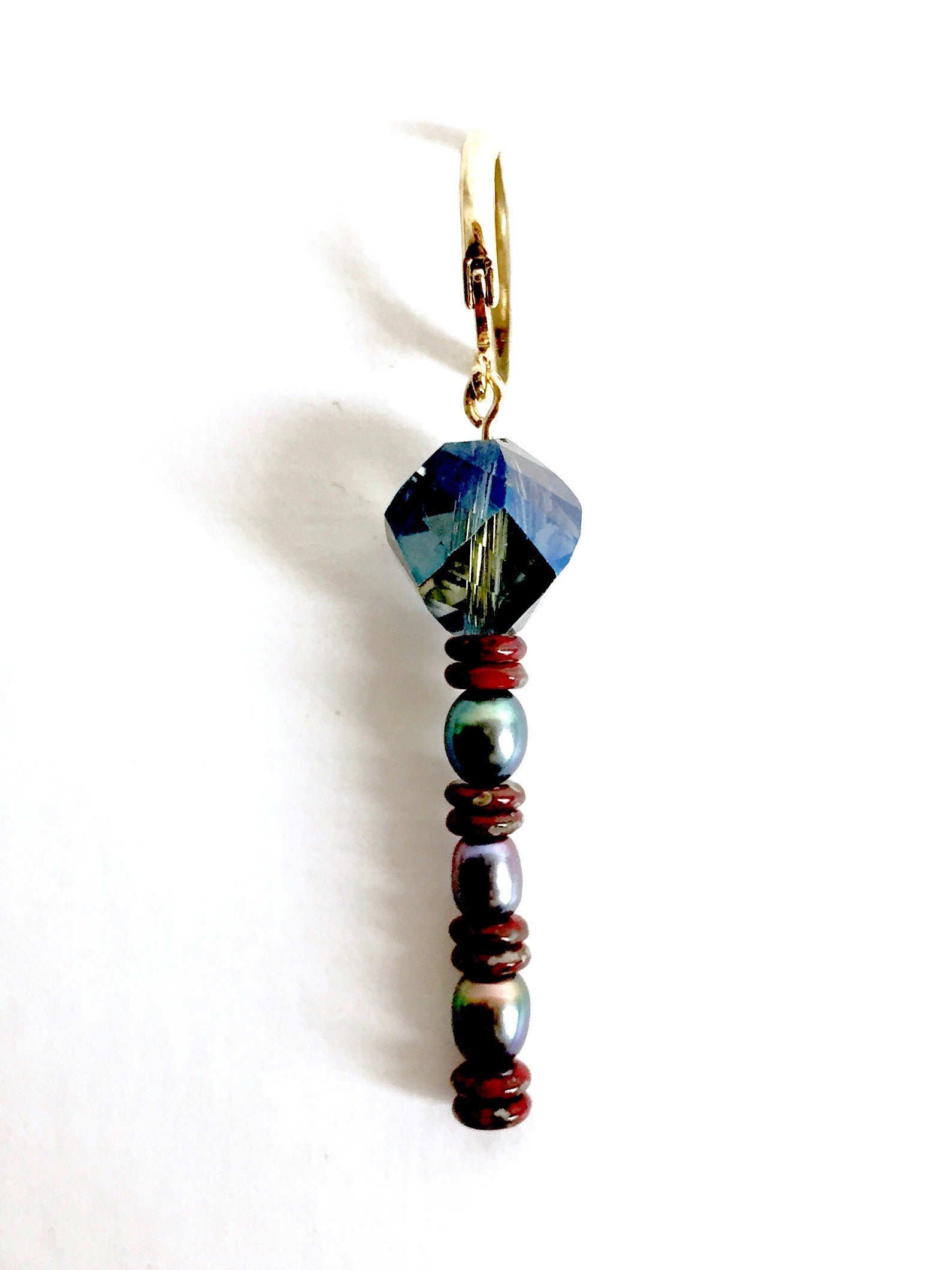 Stoere halflange oorbellen van zwarte pareltjes afgewisselt met 2 kleine donkerrode schijfkraaltjes en een mooie heldere blauwe facetkraal van Tjechisch glas.
