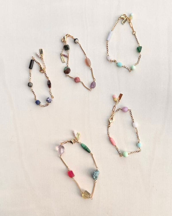 Fijn armbandje met grote kleurrijke stenen: Citrien, Turqoise, Malachiet, Amethist, pareltjes en Chaldecoon. Uniek en handgemaakt door Mevrouw Pak
