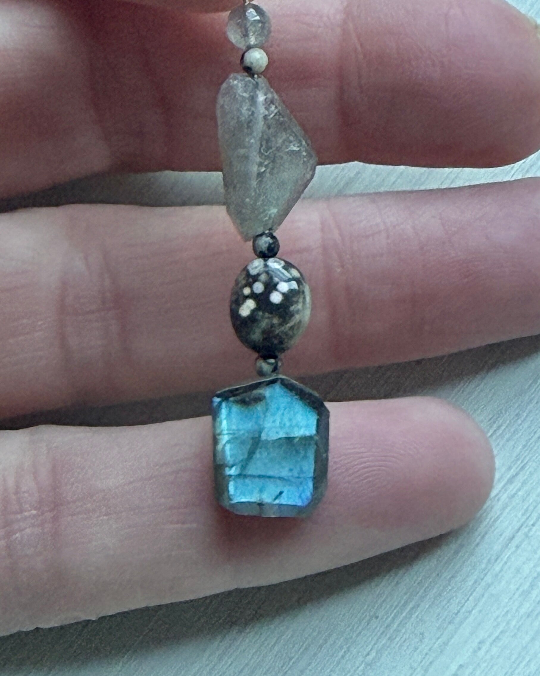 Lange mistige oorbellen van semietransparante Labradorite pareltjes en facetgeslepen stenen met gespikkelde Ocean Jaspis nuggets. Tussen de grote kralen kleine Jaspis Dalmatier pareltjes