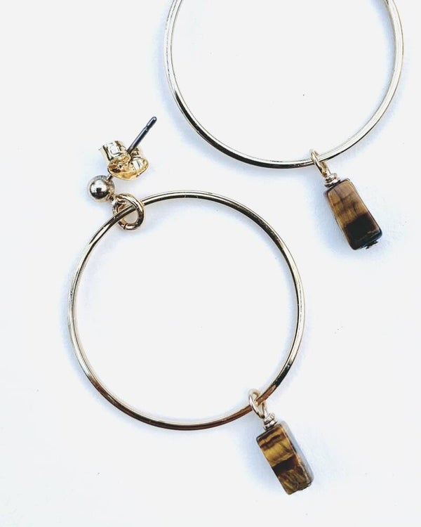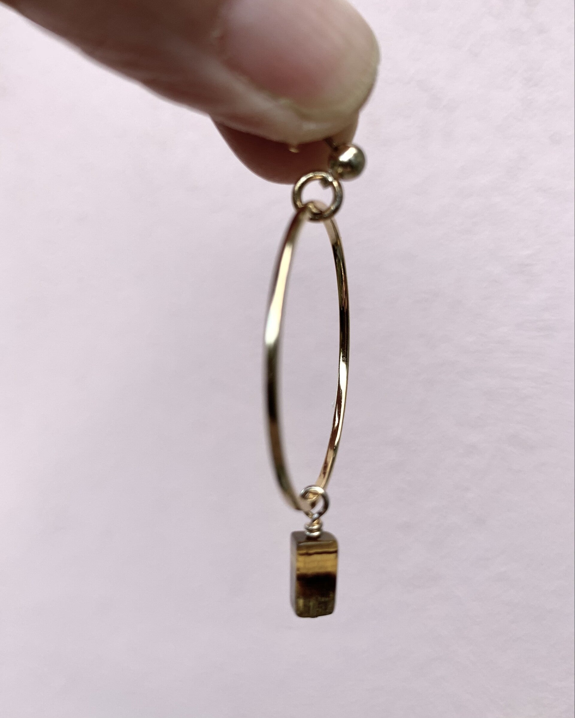 Een set goldplated creolen met een staafje van mooie Gele Tijgeroog
