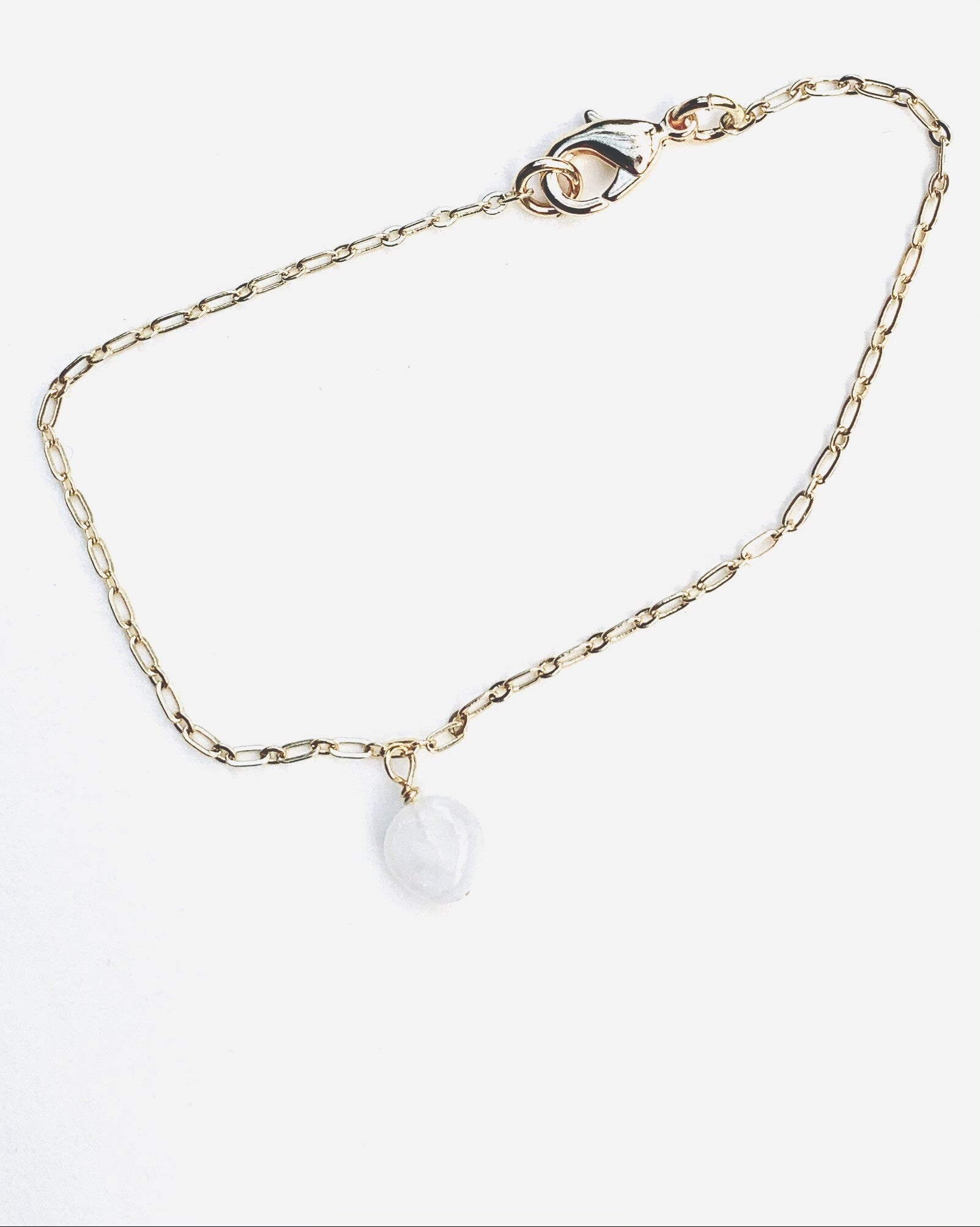 Verfijnd goldplated schakelarmbandje met een Regenboog Maansteen parel. Deze opaal is licht doorschijnend melkwit met een kleine glinstering