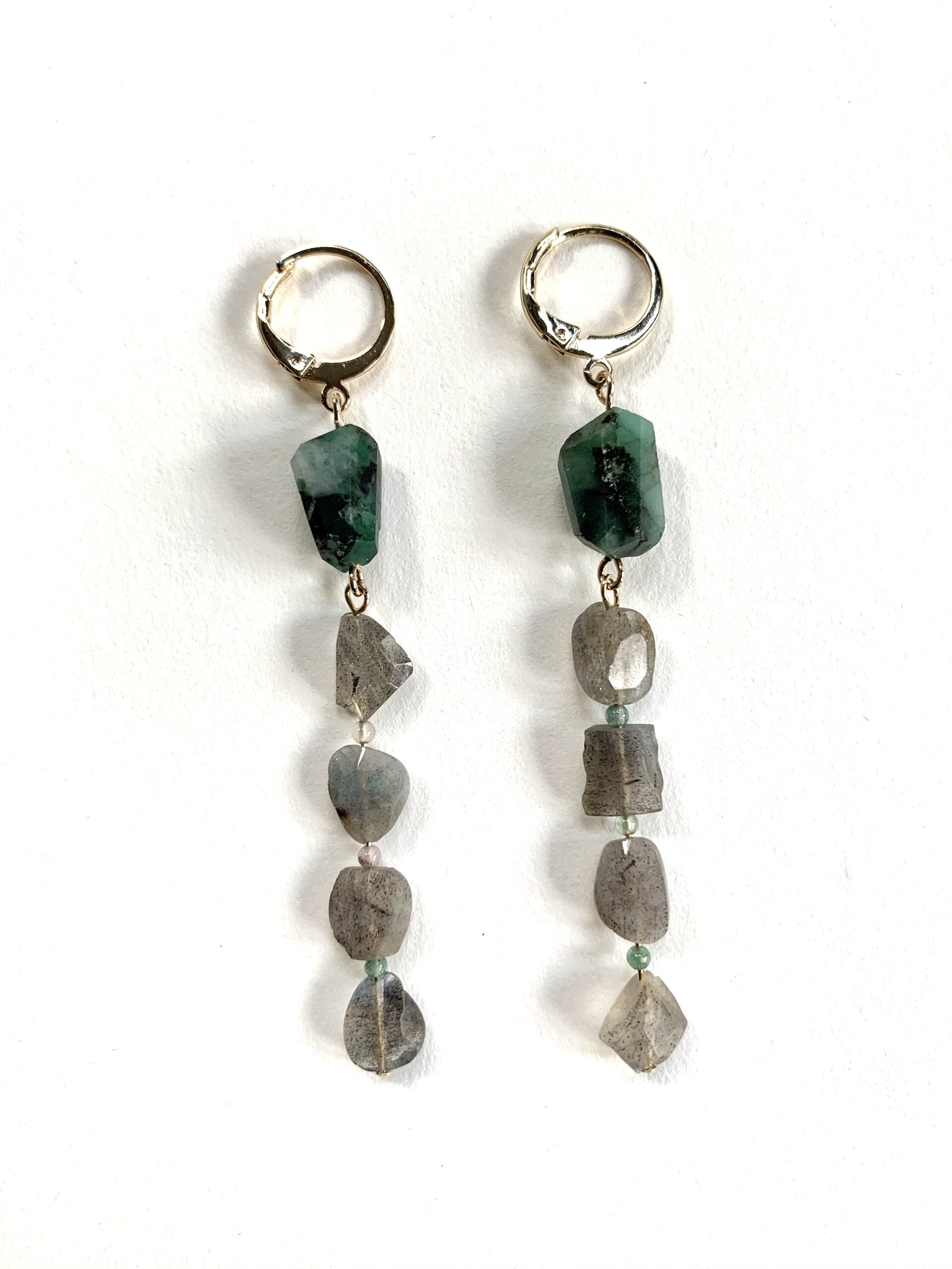 Lange mistige oorbellen van semietransparante Labradorite met wame flonkertjes en een bosgroene Smaragd. Tussen de grote kralen kleine Snake Dragon Jade pareltjes