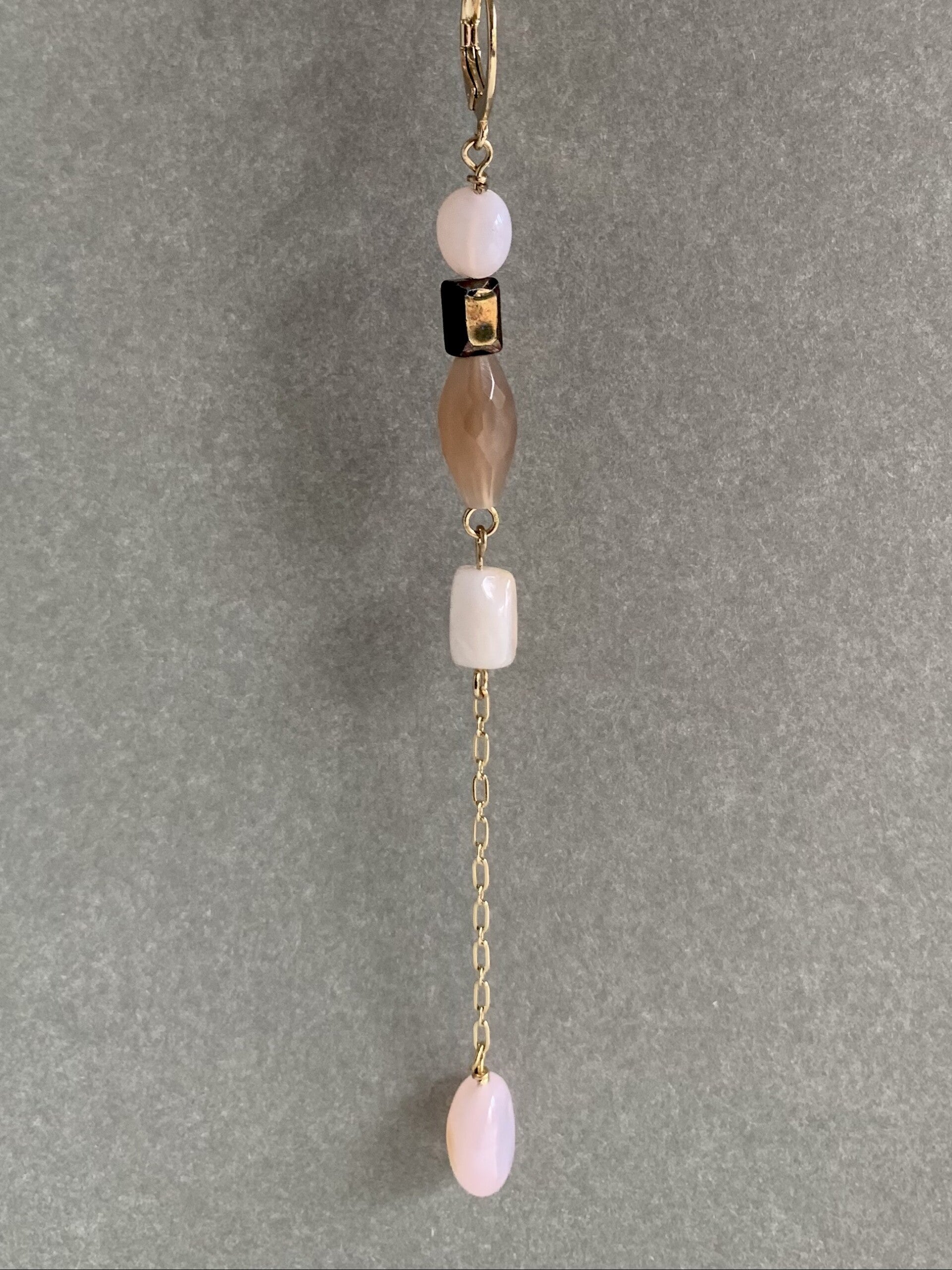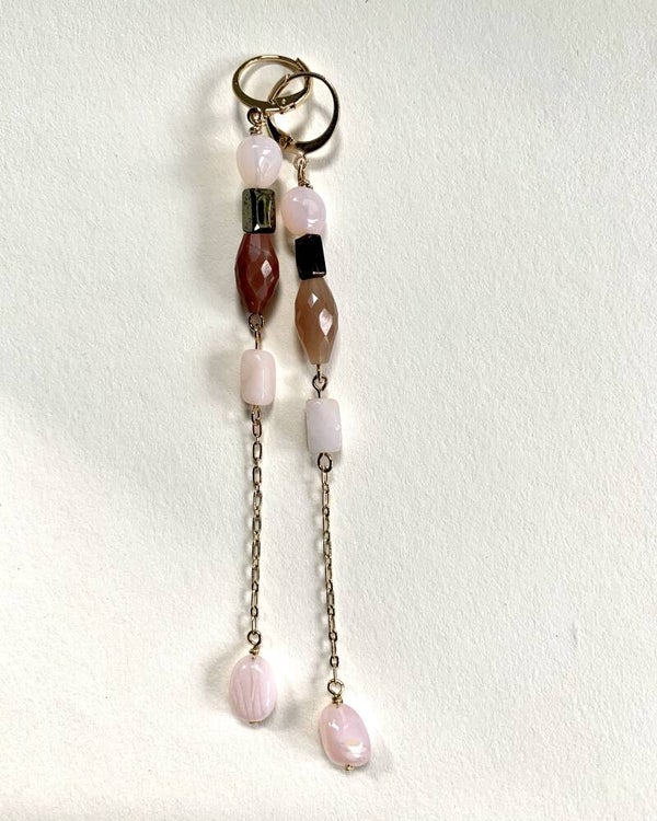 materiaal: goldplated findings, roze opaal, Spinel en Maansteen
