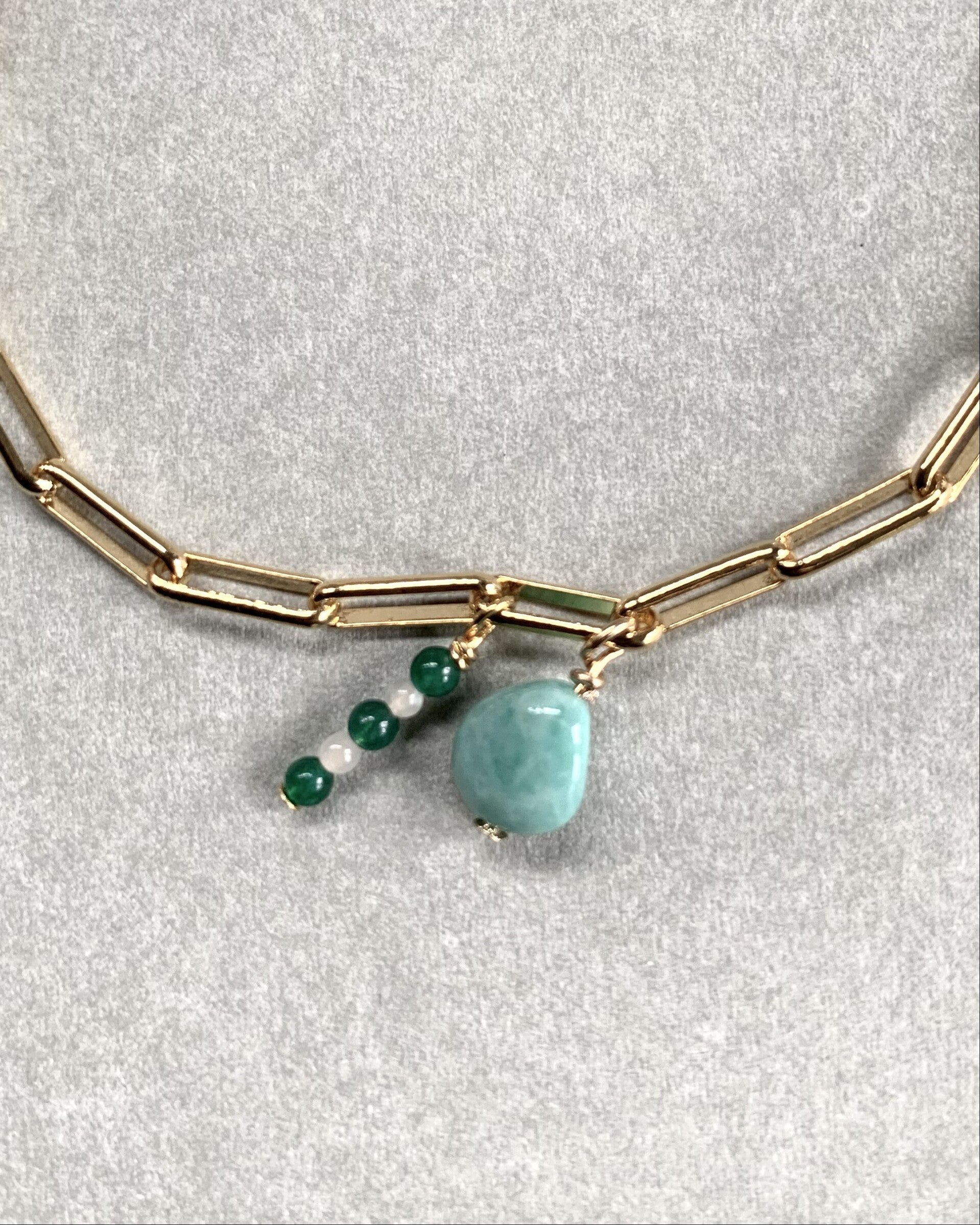 materiaal: goldplated findings. Stenen: Amazoniet met groene Jade en Rosequartz