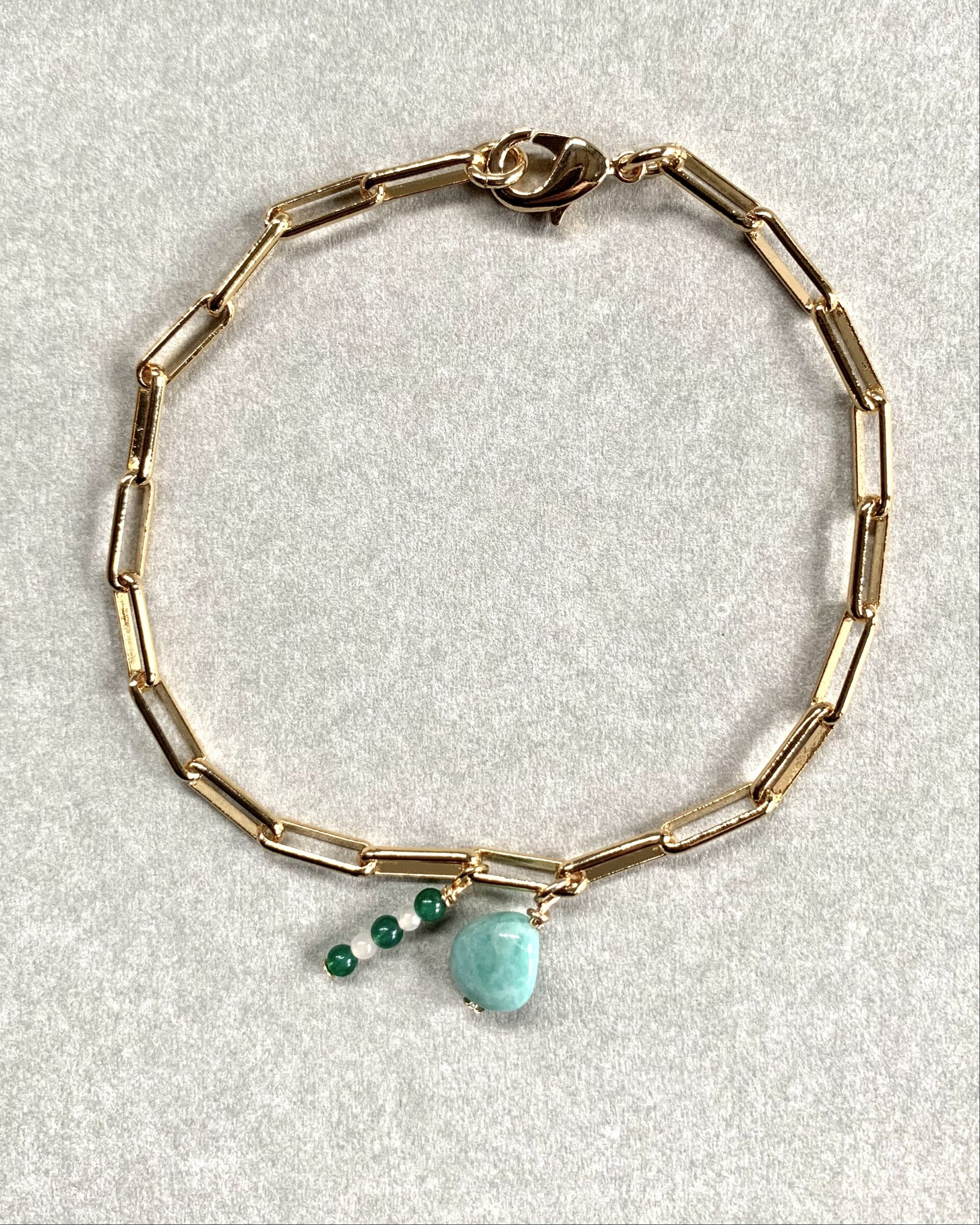 Vrolijk en stoer armbandje met een wat groter recht schakeltje. De bedeltjes zijn een opaque Blauwgroene Amazonietparel en een staafje van geregen groene Jade en Rosequartz pareltjes. Het armbandje hangt iets losser om de pols maar is eenvoudig korter te maken.
