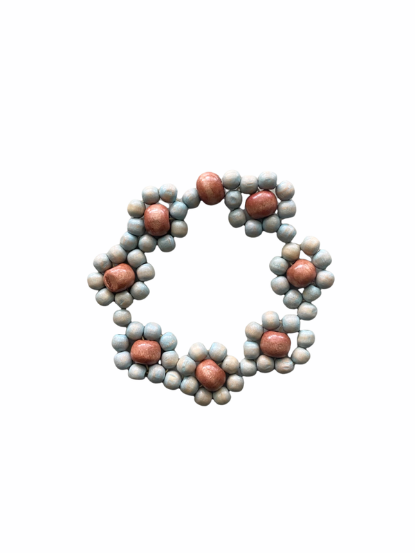 Daisy armband van houten kralen op dubbel geregen mat goudkleurig beadalon elastiek.