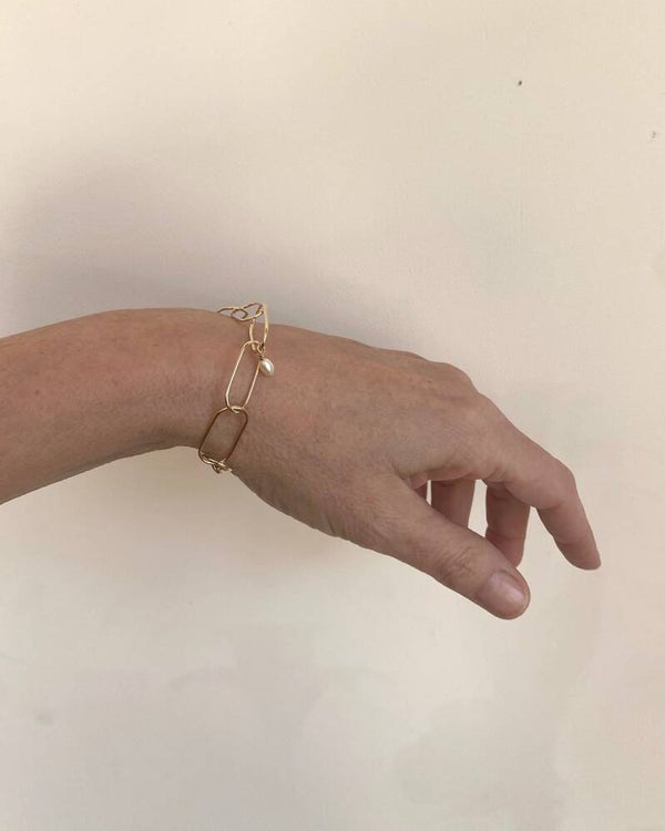 Eenvoudig en licht schakelarmbandje van twee cm lange slanke schakels met klein cultive Pareltjes.