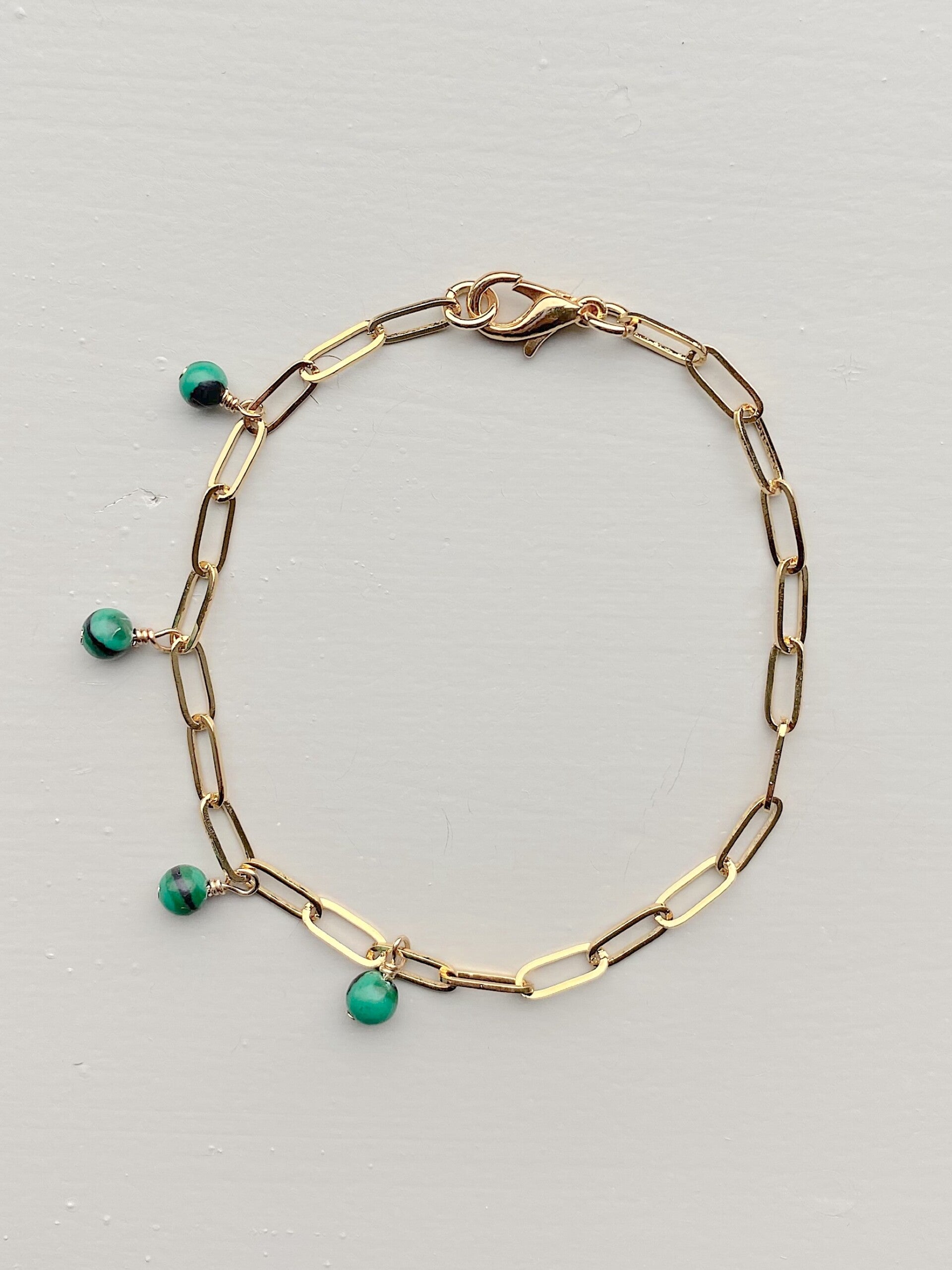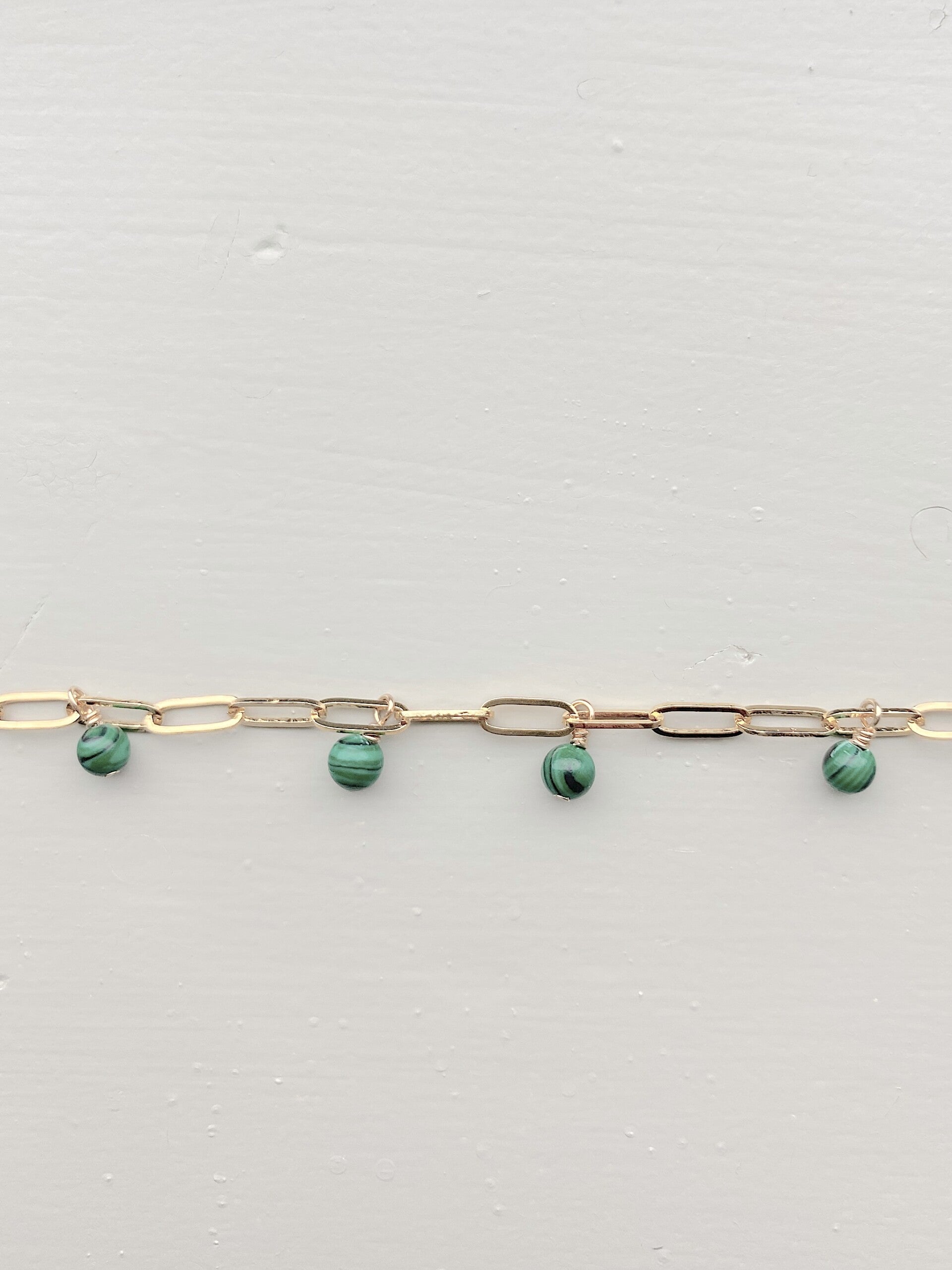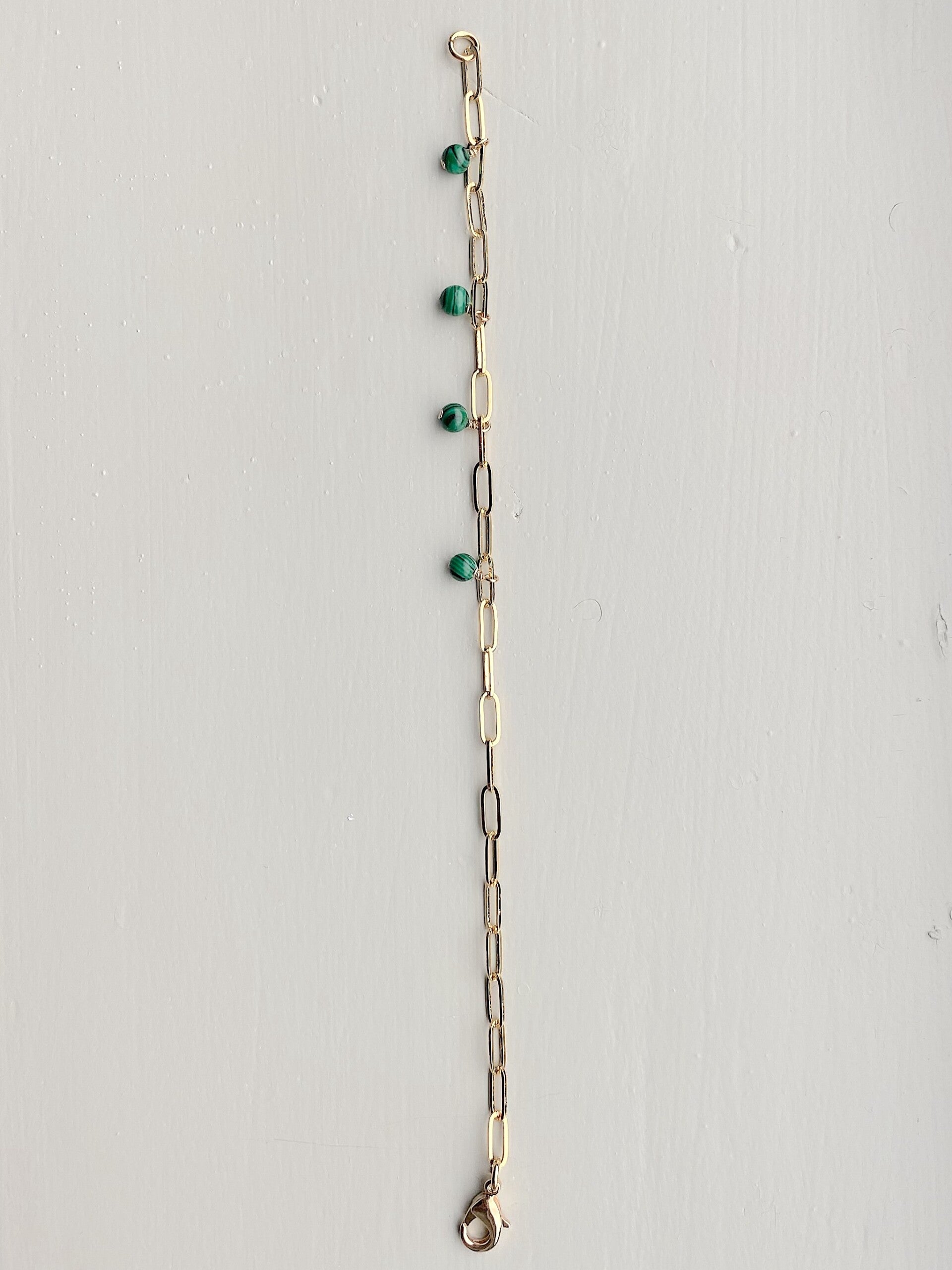 NEW - Schakeltjearmbandje met vier bedeltjes met kraaltjes van Malachiet. De bedeltjes hangen subtiel aan een kant van de armband.