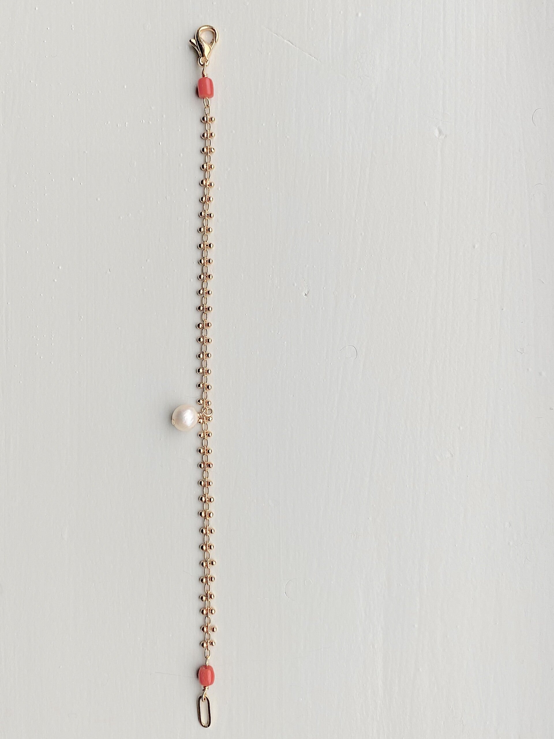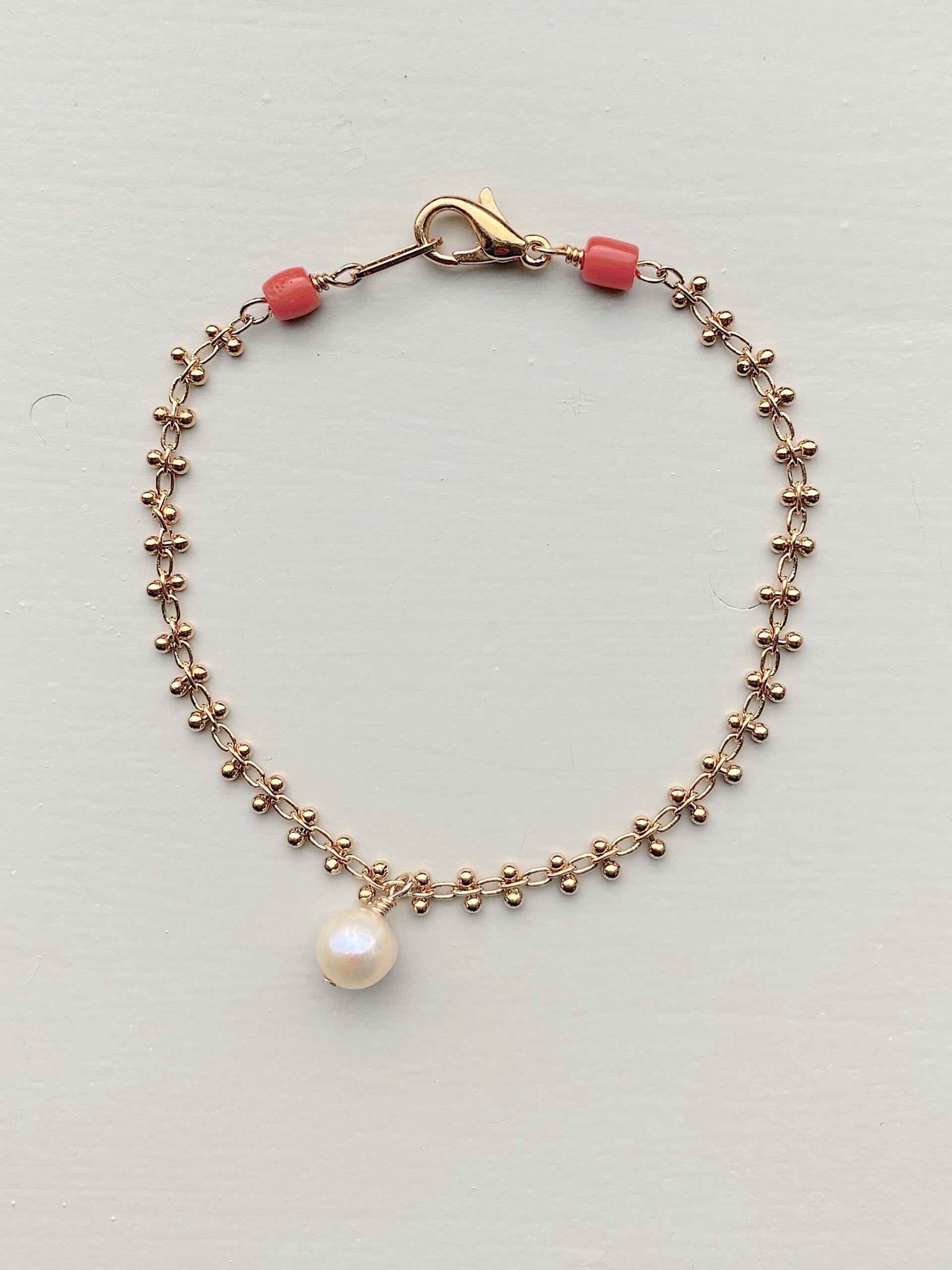 NEW - Klassiek armbandje met een bijzonder schakeltje. Om en om steekt er een klein staafje met gouden balletjes door de schakel. Aan weerszijden een vintage Zeeuwsche Bloedkoraal en iets van het midden een bedel van een vintage cultivated Pearl.
