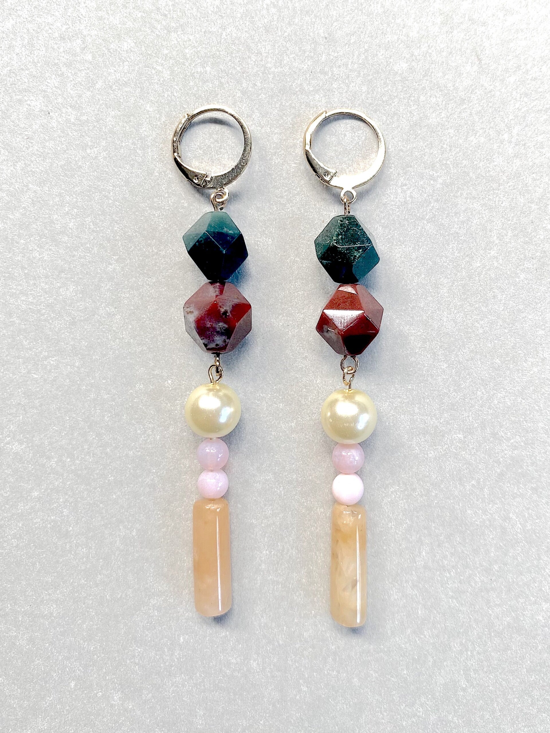 Lange Queenie oorbellen met Indiase Bloedstenen, Parel, lichtroze opalen parels en Aventurijn