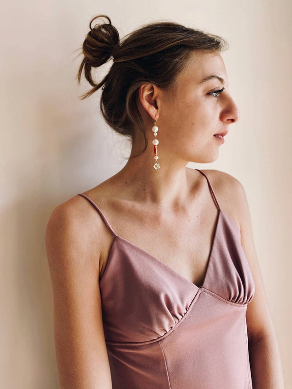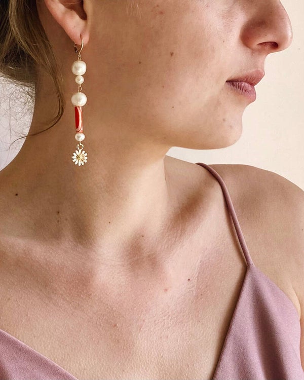 Lange Queenie oorbellen met Parel, Jade en een roze emaille goldplated daisy