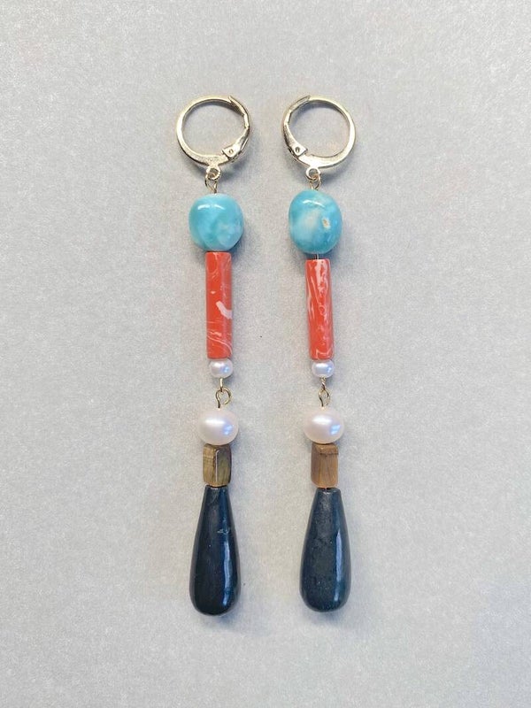 Lange Queenie oorbellen met Larimar, Jade, Tijgeroog, Shungite