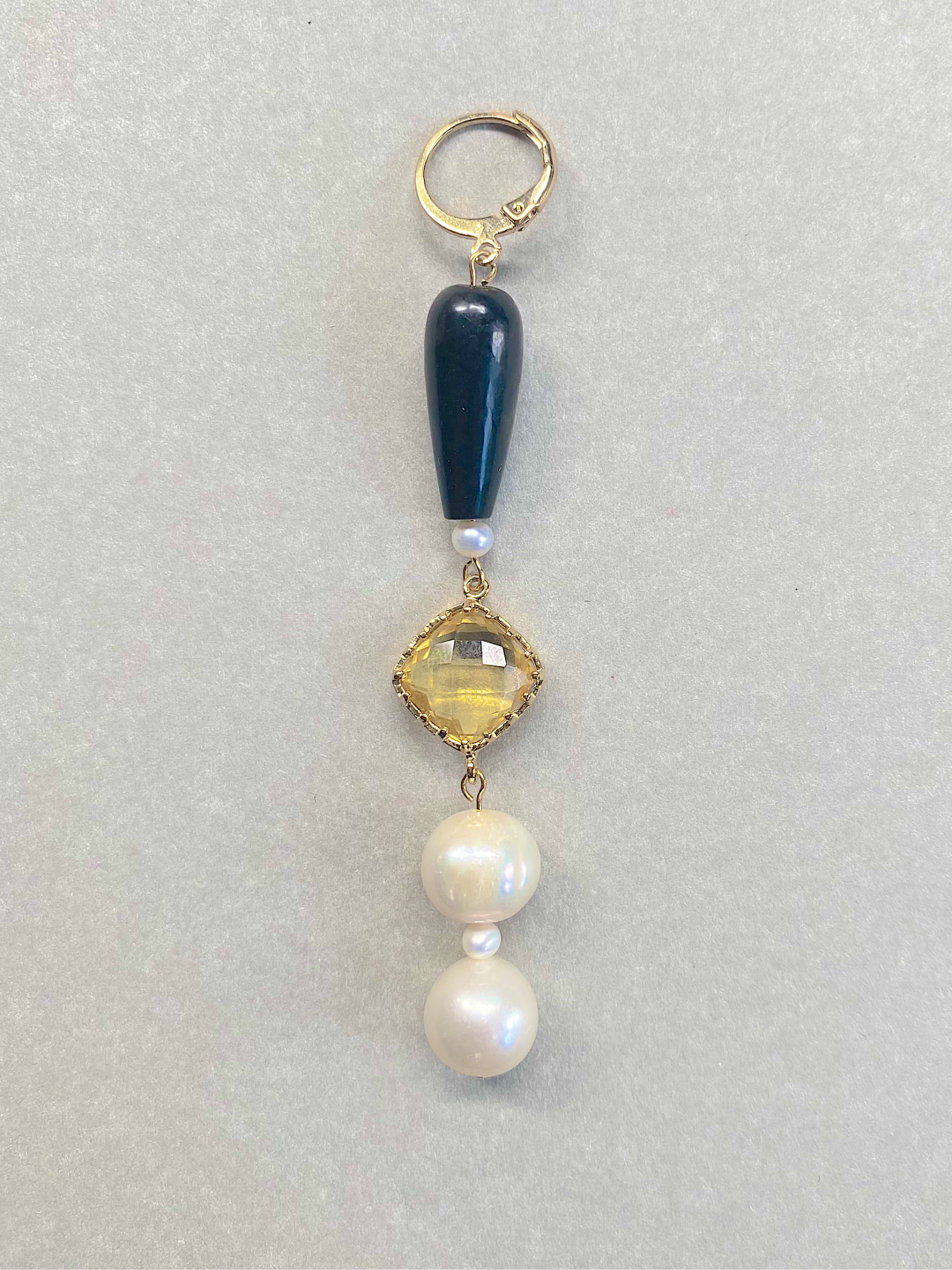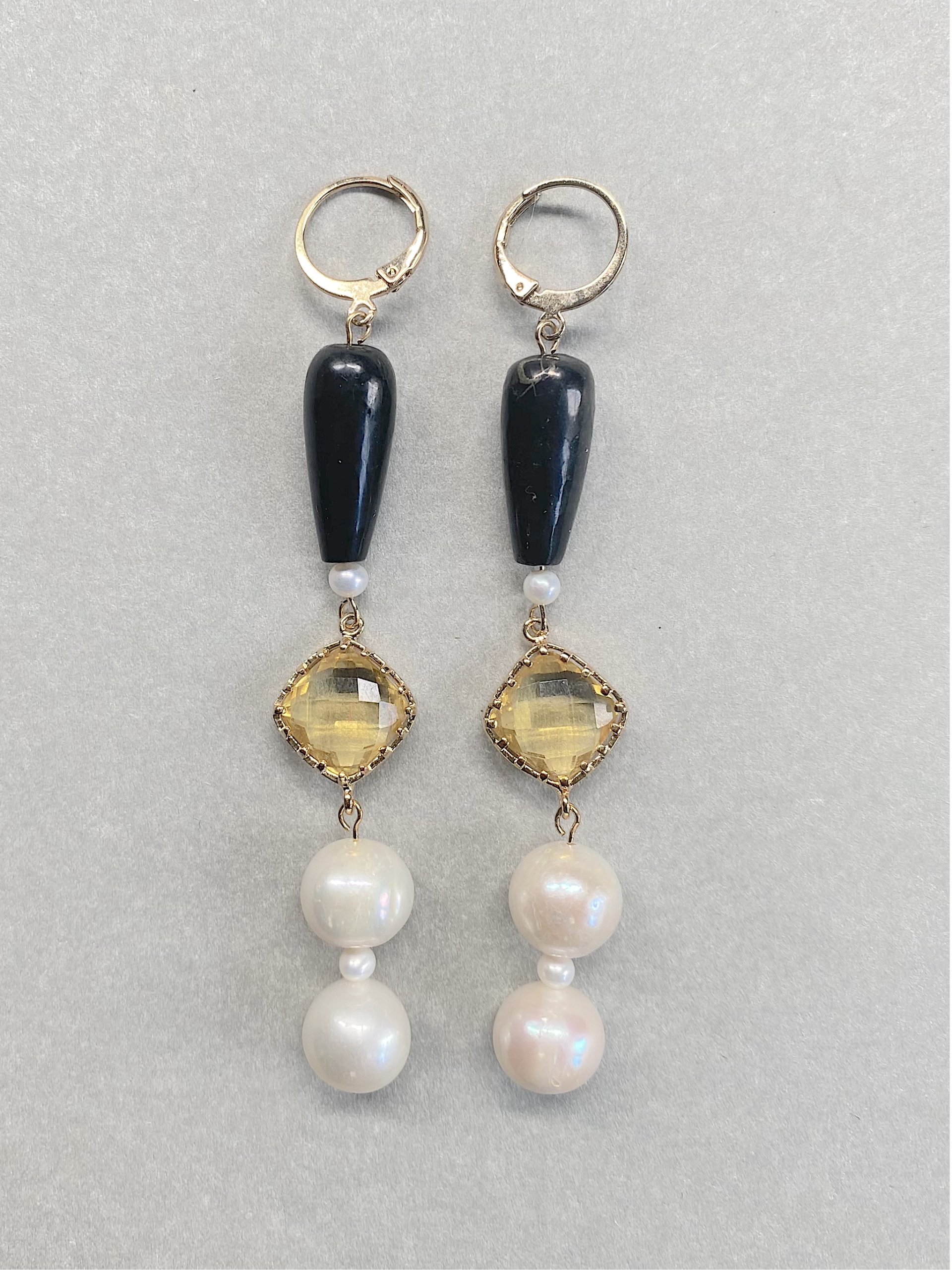 Lange Queenie oorbellen met Shungite, grote en kleine Parels en een goldplated bedel met gele Quartz