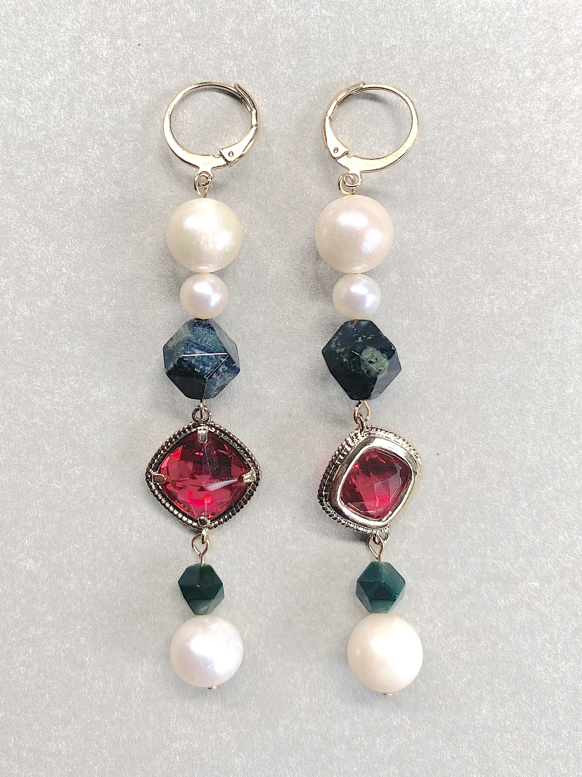 Lange Queenie oorbellen met grote en kleine Parels, Indiase Bloedsteen en goldplated bedel met rode Quartz