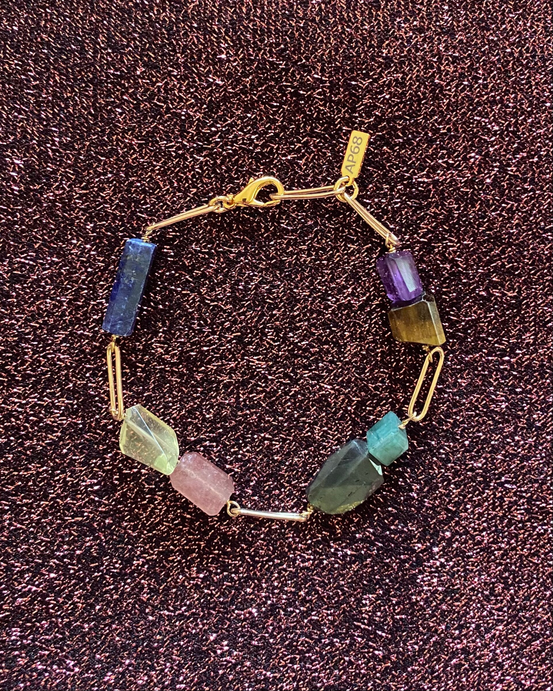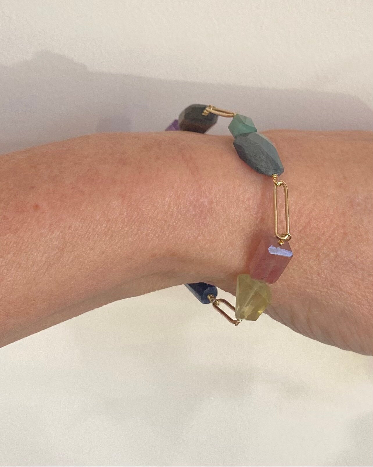 Klassiek, stoer maar fijn en uniek is deze mooie armband met 7 grote organisch geslepen edelstenen tussen 14k. vergulde schakels