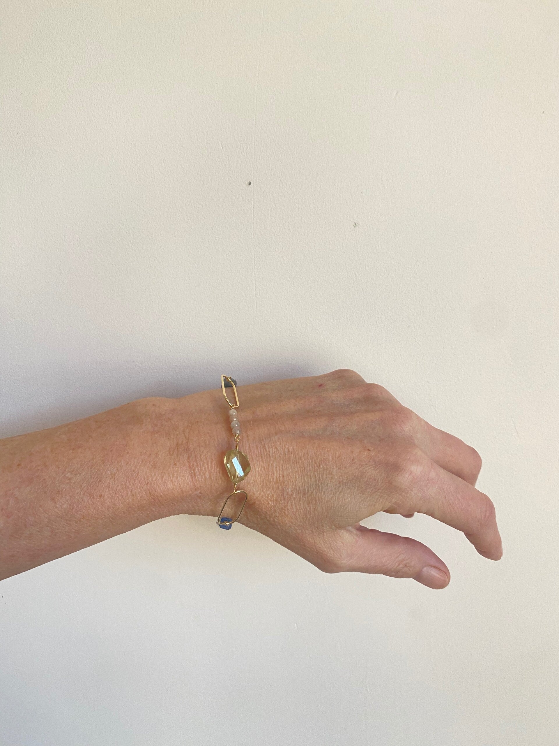 Handgemaakte armband met ranke 14k. vergulde schakels met veel blauwe tonen. Blond en stoer.
