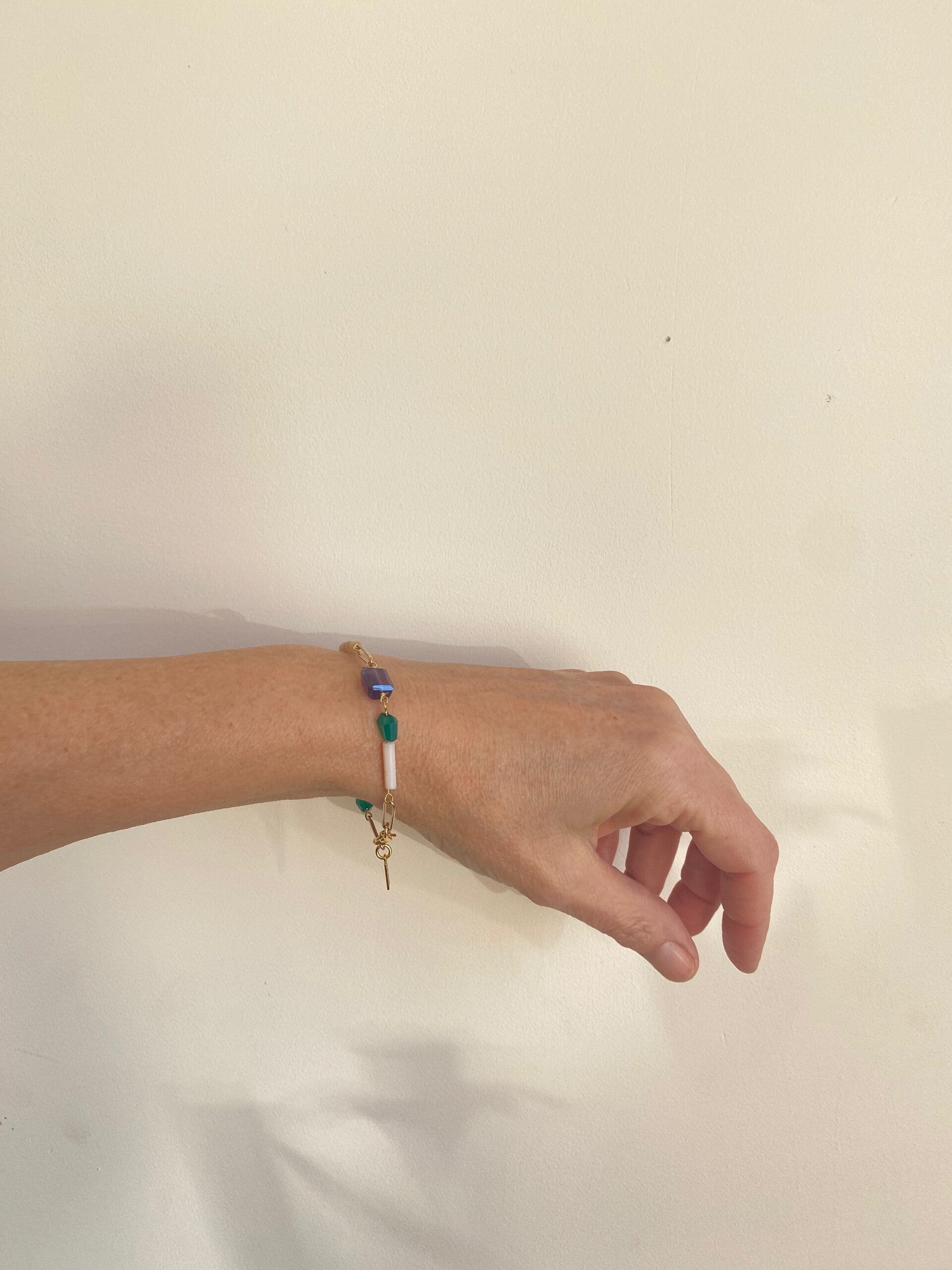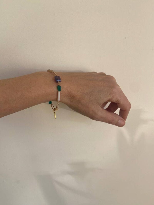 Lieve kleurrijke armband met o.a opvallende fris groene facetgeslepen Onyx stenen tussen 14k. vergulde schakels