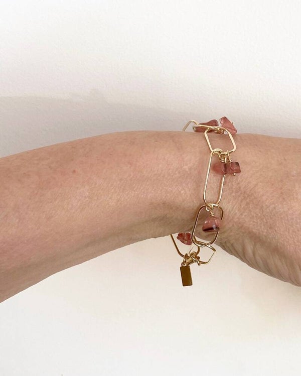 Handgemaakte armband met 9 bedeltjes van donkerroze Rose Quartz aan 14k. vergulde ranke schakels.