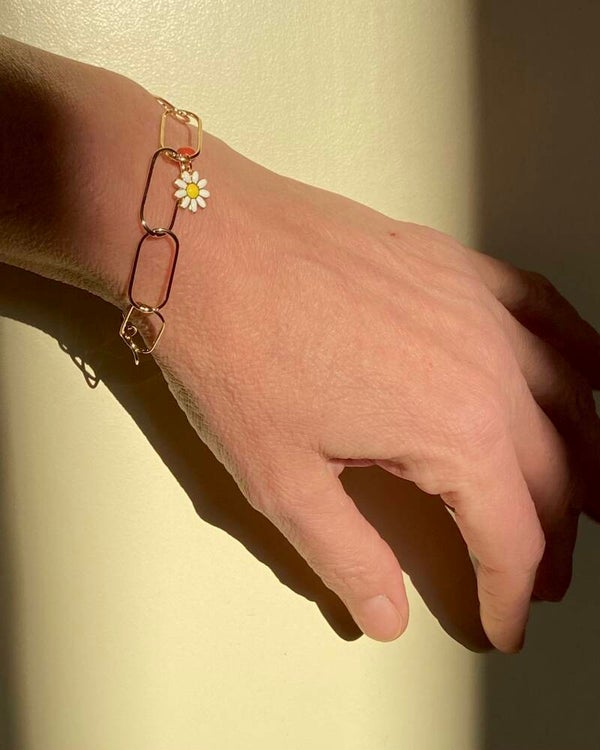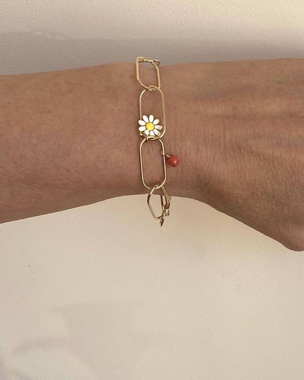 Eenvoudig en licht schakelarmbandje van twee cm lange ranke schakels met een Klein emaille Madeliefje en twee vinatge Zeeuwse bloedkoralen kralen.